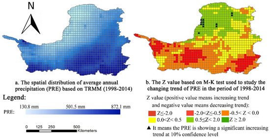 To analyze the spatial distribution and the variability of the precipitation in the Loess Plateau, the average precipitation during 1998–2014 of each grid was calculated and the M-K trend test was applied to analyze the changing trend in each grid, as shown in Figure 5.
