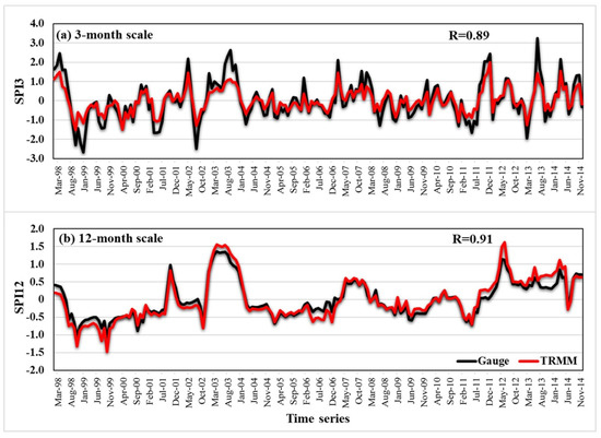 Comparison of Standardized Precipitation Index (SPI) time series calculated both from rain gauge observations and from Tropical Rainfall Measuring Mission (TRMM) estimation at 3-month scale (a) and 12-month scale (b).