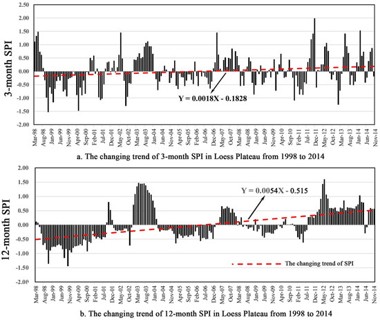 Figure 7a,b show the temporal variation of the average values of 3-month SPI (SPI3) and 12-month SPI (SPI12) in the Loess Plateau from 1998 to 2014. As illustrated in Table 1, when the SPI value is greater than zero, it indicates a wet event and negative values represent a drought event.