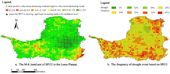 Based on the M-K test method, we calculated the Z values in each grid to analyze the changing trend of SPI12, which are shown in Figure 8a. Meanwhile, the frequency of drought event is calculated in each grid in the Loess Plateau. In this study, if the SPI12 in a specific grid is lower than 0, it is defined that the drought event occurred in this grid. The result is shown in Figure 8b.