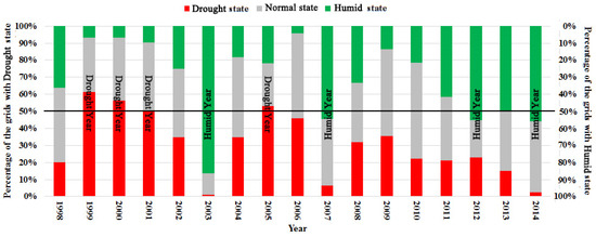 To analyze the temporal characteristics of drought and humid events under climate change, we proposed new definitions of drought and humid year based on the SPI drought index categories. In this study, the whole Loess Plateau has been partitioned into 1150 grids, and each grid has a SPI12 value to represent the degree of drought in every year during the period of 1998–2014. If the SPI12 is greater than 0.5, the grid is defined as a humid state. If the SPI12 is lower than −0.5, the grid is defined as a drought state and if the SPI12 is between −0.5 and 0.5, the grid is defined as a normal state. For the whole Loess Plateau, if the total number of the grids in a humid state in a specific year accounts for >50% of the total number of grids, this year is defined as a humid year. If the total number of the grids in a drought state in a specific year accounts for >50% of the total number of grids, this year is defined as a drought year.