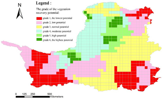 According to the vegetation recovery potential assessment method described above in Part 3.4, the grade of the vegetation recovery potential was qualitatively determined in the 1150 grids of the whole Loess Plateau, and the spatial distribution of the potential grade for the vegetation recovery was drawn by the GIS tool, as shown in Figure 11.