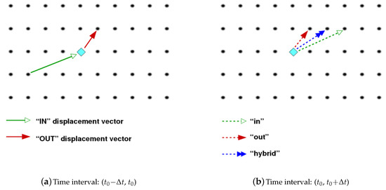Please note that the indices span the ranges and within the spatial domain of interest. In the in type, we deal with a moving frame of reference, as we closely follow the path of each radiance value starting from the initial incoming (in) displacement. In this framework, each radiance value can be thought of as a particle featuring its own motion, and the iteration describing its evolution is as follows (where and are obtained by averaging over the several in displacements found in the variational procedure, and refer to the incoming (in) displacements):