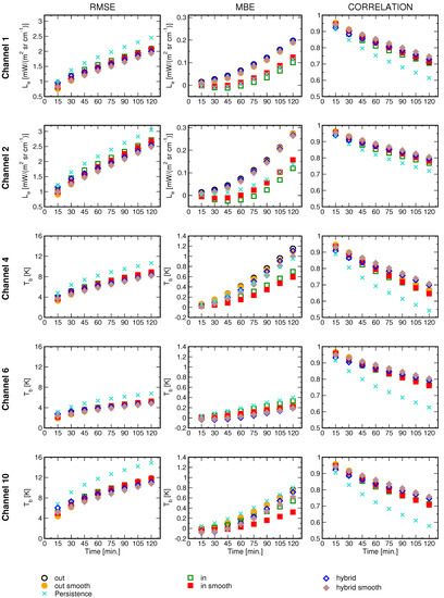 The output of the first part of the algorithm is analysed by comparing the six variants discussed in Section 2.1, against the MSG-SEVIRI measured values; we also include in the comparison the simple persistence model (here implemented by keeping the MSG-SEVIRI channels radiance values across the entire time interval). Figure 3 shows the statistical analysis by means of the Root Mean Square Error (RMSE), Mean Bias Error (MBE) and Correlation for the two visible channels (Ch. 1, 2), the near-infrared (Ch. 4) and two infrared channels (Ch. 6, 10). In this work the BIAS is computed as the mean of the differences between the forecast and MSG measured radiances for every pixel; the MBE is obtained as the average of the BIAS over the whole sample of 48 case studies. It is worth noticing that these channels are the most relevant ones for the calculation of the solar irradiance through AMESIS. The simple persistence model is outperformed (in terms of both RMSE and Correlation) by all the other methods, at all times within the forecast interval. The improvement relative to the persistence model is negligible at the first nowcasting time step (i.e., after 15 min) and increases with time. Figure 3 shows that the hybrid smooth is the most performing among the variants in terms of RMSE and Correlation; for all channels the correlation ranges between the maximum value of 0.97 and the minimum value of 0.7 within the 2 h of prediction. However the hybrid smooth reveals a relatively higher bias compared to the other variants, while the in variant minimises the BIAS for the visible bands (Ch. 1, 2). We point out that the analysis is based on the average over the whole dataset (48 case studies) considered in this work, and concerns the estimate of radiances in each pixel and for every SEVIRI channel. Finally, the first stage of the algorithm (i.e., the nowcasting process) revealed the following: (i) all of the variants used here show very good agreement with the MSG-SEVIRI measured values of radiances for each channel (e.g., correlation is greater than 0.7 even after 2 h of nowcasting); (ii) all the methods clearly show very similar trends, improving on the predictions provided by the simple persistence model; (iii) relative to the visible bands (Ch. 1–2) the hybrid smooth and the in approaches are the most performing variants in terms of RMSE/Correlation and Bias, respectively. For the reasons above, in the second part of the algorithm we use both in and hybrid smooth based outputs, as inputs in AMESIS for the estimation of surface solar irradiance.