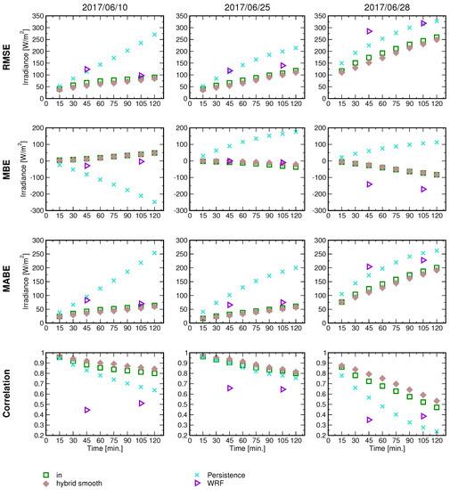 Statistical scores for irradiance obtained with the hybrid smooth (brown diamonds) and in (green squares) methods, the simple persistence (turquoise crosses) and the WRF (violet triangles) models, relative to three case studies (10 June 2017 left coloumn; 25 June 2017 central coloumn; 28 June 2017 right coloumn). The time origin refer to 13:00 UTC on the 10 June 2017, and to 08:00 UTC on the 25 June 2017 and 28 June 2017. The scores are based on the computation of the Root Mean Square Error, Mean Bias Error, Mean Absolute Bias Error and Correlation (first, second, third and fourth row respectively) for the hybrid smooth and in nowcasting methods, the Persistence and WRF output irradiances, each of these evaluated with respect to the irradiance calculated through AMESIS based on the MSG-SEVIRI measured radiances. Corresponding irradiance maps, relative to the 3rd (after 45 min) and 7th (after 105 min) time step, are reported in Figure 5.