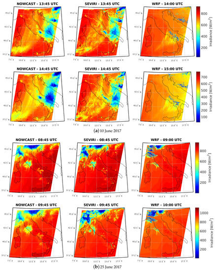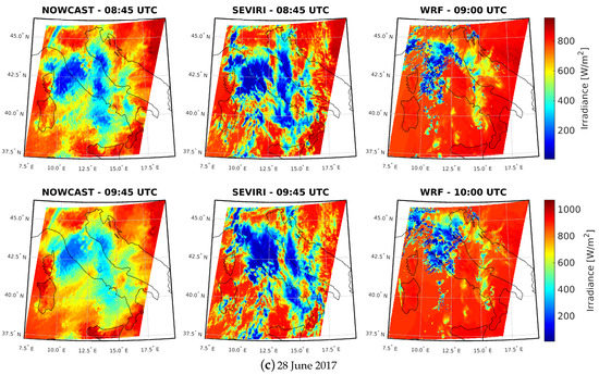 To characterise the second part of the algorithm (described in Section 2.2) and evaluate its performance, we have selected three particular case studies: these feature the lowest (10 June 2017, afternoon), intermediate (25 June 2017, morning) and highest (28 June 2017, morning) RMSE value for the forecasted radiances of the SEVIRI visible channels, according to the hybrid smooth performance in the nowcasting scheme analysis. We therefore expect a direct relation with the AMESIS solar irradiance output, such that the aforementioned case studies will prove to be the best, intermediate, and worst irradiance forecast within the dataset, respectively. In Figure 4 we report the statistical analysis for the above case studies, comparing the irradiance predicted by means of the hybrid smooth and in nowcasting approaches against the benchmark models of simple persistence and WRF. The statistical measures are evaluated with respect to the irradiance calculated through AMESIS based on the MSG-SEVIRI measured radiances. We should also point out that solar irradiance predictions based on hybrid smooth, in and simple persistence approaches are obtained through AMESIS by using the corresponding forecasted radiances values as inputs, whereas the WRF solar irradiance is computed within the code using the model atmospheric variables to solve a parametrized radiative transfer (see Appendix A). We include the WRF prediction in the comparison analysis in order to quantify the potential improvement by using the nowcasting approach within the first two hours of forecast, instead of the WRF prediction. The WRF irradiance predictions are available on a hourly basis, at specific times, i.e., at 14:00 UTC and 15:00 UTC for the afternoon case on the 10 June 2017 and 09:00 UTC and 10:00 UTC for the morning cases on the 25 June 2017 and 28 June 2017. We compared the above against the time collocated nowcasting-based AMESIS predictions; the times selected for the comparison correspond to the 3rd (08:45 or 13:45 UTC) and 7th (09:45 or 14:45 UTC) temporal step of the hybrid smooth/in nowcasting process, i.e., after 45 and 105 min, respectively. The results shown in Figure 4 reveal the following: (i) the predictions based on the hybrid smooth method are more accurate then the predictions based on the in method; (ii) the irradiance forecasted with the benchmarks models feature a systematically higher RMSE and lower Correlation, at all times and in each case study; (iii) the correlation relative to the nowcasting methods proposed in this work is relatively stronger across the entire time interval; in the worst case scenario (28 June 2017) it reaches the lowest value of 0.52 only after two hours of forecast, whereas it ranges between 0.85–1 for the two other cases, hence demonstrating the robustness of the procedure. By combining the statistical scores of the hybrid smooth method, obtained for the three cases analysed in Figure 4, we find that the mean value ranges between 0.94 and 0.73 for correlation, between −1 W/m and −18 W/m for bias and between 61 W/m and 147 W/m for the rmse (values are calculated after 15 min and 2 h, respectively). In order to give a qualitative overview of the results, the corresponding irradiance maps are reported in Figure 5, where we compare the AMESIS-based hybrid smooth predictions (proved to be the best nowcasting method in this work) and the WRF calculated output, against the AMESIS-based SEVIRI measurements, for the three case studies analysed (10 June 2017; 25 June 2017; 28 June 2017). The results show that irradiance maps obtained through nowcasting (hybrid smooth) largely reproduce the SEVIRI observed results, however featuring smooth low-irradiance regions, as expected. The WRF results tend to underestimate the cloudy regions instead, and this occurs for all the case studies examined. We should further stress that the purpose of Figure 5 is only to provide a qualitative comparison of the irradiance maps obtained with nowcast, WRF and SEVIRI measurements, for the case studies analysed. One can clearly infer the distribution of cloudy systems (regions of relatively low irradiance) in the maps, and qualitatively evaluate whether the simulated patterns match the SEVIRI observations.