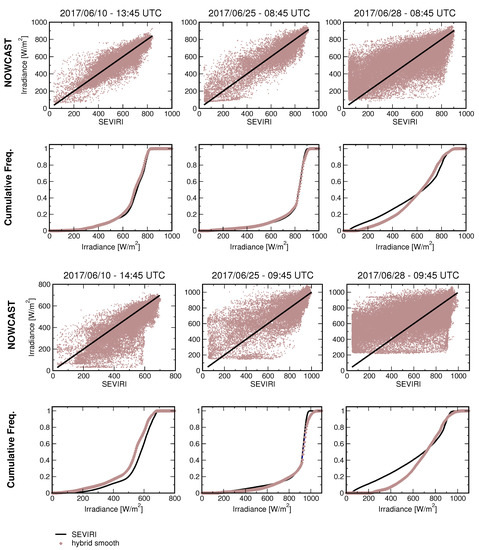 We now further investigate the statistics of the irradiance output derived with the most performing nowcasting method, namely the hybrid smooth; this is compared against the AMESIS-based irradiance derived with MSG-SEVIRI measured radiances, by evaluating scatter plots and cumulative frequency curves. In Figure 6 we show the scatter plots for the irradiances obtained with the nowcasting methodology, for the same case studies and times shown in Figure 5. We notice that nowcast predictions follow a regular distribution and feature a relatively low spread compared to the SEVIRI output, at the 3rd time step (i.e., after 45 min) of the nowcasting process. This is further supported by the cumulative frequency curves, also shown in Figure 6, which demonstrate a very good agreement between predictions and MSG measured values (except for the worst case scenario on 28 June 2017). As expected, the agreement and correlation between measured and simulated data tend to reduce after 105 min, at the 7th time step, as also shown in Figure 6. Based on the above outcome, the nowcasting approach described here may be used to complement the WRF solar irradiance prediction, especially within the first two hours forecast time. In such a way, a self-consistent approach providing an efficient monitoring, nowcasting up to 2 h and forecasting beyond 2 h of solar irradiance maps, is derived through the integration of AMESIS, cloud motion techniques, and WRF model.