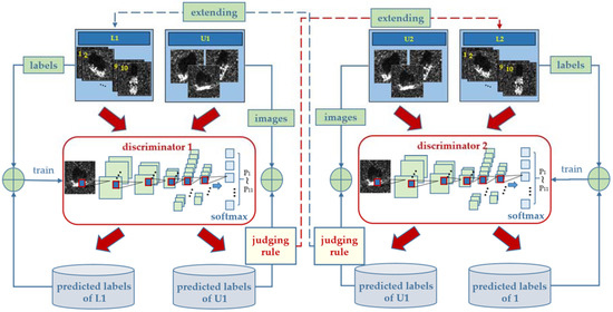 | Inputs: Original labeled training sets and, original unlabeled training sets and, the prediction sample sets and , the discriminators D1 and D2, the error rates and , the update flags of the classifiers and . Outputs: Two vectors of class probabilities and. |