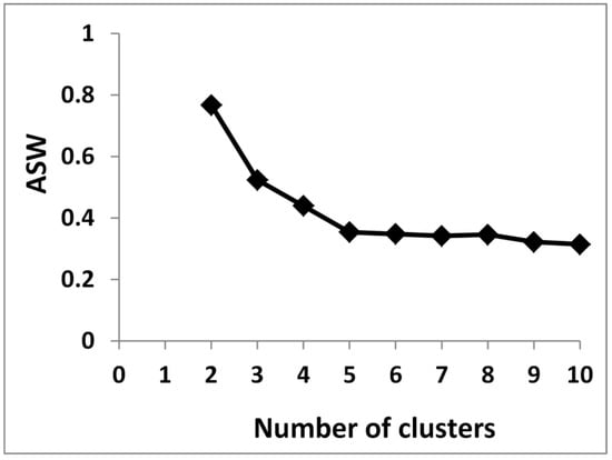 The k-means algorithm was applied to the clustering analysis. As mentioned, the silhouette method [] was used in order to determine the optimal number of clusters. For each individual object i of the cluster, the silhouette width value, s(i), is defined as