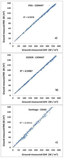 PAR measured versus GHI measured for validation stations: (a–c) correspond to PSA-CIEMAT, CEDER-CIEMAT, and Santiago-EOAS stations, respectively.