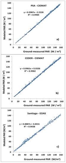 Figure 3 clearly shows the good linear relationship between both variables. Only one data point of PSA-CIEMAT had to be removed according to the coherence filter applied due to some punctual incidence on the ground sensors. The ground-measured and filtered GHI values at these places were introduced in Equation (4) and the obtained PAR values were compared with the ground-measured PAR values. This comparison can be appreciated in the corresponding correlograms (Figure 4).