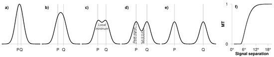 Illustration of the ideal spatial resolution computation for filter windows. Two Dirac pulses (gray lines in (a–e)) are set up at points P and Q and the field is filtered (black lines in (a–e)). For a given filter, they are resolved as two different signals at a certain separation (c)—the ideal spatial resolution. However, the signals are more prominent after filtering (contrast), if the distance between the signals is larger (d,e). The contrast is quantified via the modulation transfer function (mtf), which is a function of the modulation transfer (cf. (6)) and signal separation (f).