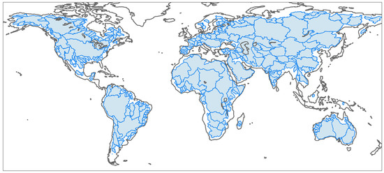 Distribution of 255 catchments used in this study. The catchments are filled in light blue with the boundary in blue. The catchment boundaries were downloaded from Global Runoff Data Centre (GRDC) website.