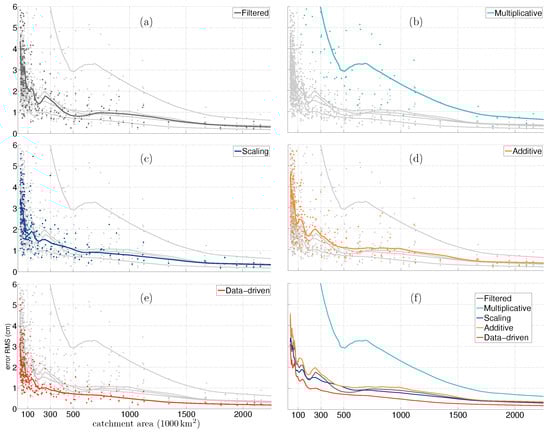 In Figure 4 and Figure 5, we have plotted the RMSE and the for four corrected time-series and time-series from filtered fields over 255 catchments. The catchments are sorted by their area. Since the scatter of these statistical measures is wide, we fit a smooth line, obtained by using locally weighted scatter-plot smoothing (LOESS), to identify the general pattern. LOESS is a non-parametric method that uses iterative locally weighted regression to fit a second degree polynomial through points in a scatter plot [48]. Since the number of large catchments is smaller than the number of small catchments, the data points on the x-axis, i.e., catchment area, suffer from unequal intervals. Therefore, we have defined bins to counter this irregular data distribution. The first bin is for catchments from 30,000 km to 100,000 km with sample points every 1000 km, the next bin is for catchments from 100,000 km to 1,000,000 km with sample point every 10,000 km, and the last bin is for catchment from 1,000,000 km to 4,000,000 km with sample points every 100,000 km. A window size of 51 is used for smoothing. We have chosen these parameters to obtain a smooth fit that would represent the general behaviour of the scatter.