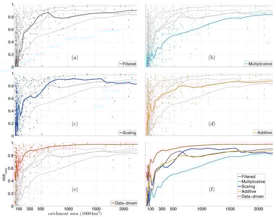 and corresponding fit with respect to the catchment area for different correction methods. Subplots (a) to (e) show and corresponding fit for one method in colour and others in gray. Subplot (f) compares the fit for different methods.