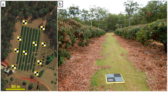 (a) Distribution and (b) in situ field photo of AeroPoints used for geo-referencing of the UAV imagery. Location: 27°37′49′′S; 153°10′58′′E.