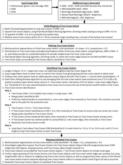 GEOBIA and the eCognition Developer 9.2 software (Trimble, Munich, Germany) were used to automatically delineate the individual tree crowns based on the CHM and the multi-spectral orthomosaic. An object-based mapping approach was deemed most suitable because of the small pixel size in relation to the tree objects being mapped [34]. A detailed flowchart of the GEOBIA processing steps is presented in Figure 4. Tree crowns were initially identified for those areas in the CHM >1 m. Tree crown objects were then grown outwards based on progressively lower CHM thresholds. The tree crown edges were adjusted based on spectral information. Once the tree crown extent had been mapped, the approximate tree crown centre of each tree was identified based on the CHM by searching for local maxima within the mapped tree extent. To avoid having multiple local maxima within a single tree crown, only the highest CHM value within a radius of 3 m was considered. Subsequently, these tree crown centres were grown outwards as long as the tree crown height decreased and until the length of each tree crown object reached 3 m. A mean filter was used to smooth the CHM for this region-growing step in order to avoid issues due to variations in tree crown height caused by irregular branches increasing tree height within parts of individual tree crowns [18,33].