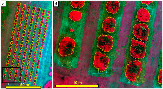(a) False colour (Green, Red, NIR) image of pre-pruned lychee trees; (b) tree crown extent map; (c) tree crown extent map exposed to averaging filter with kernel size of 81 × 81 pixels; and (d) single tree crowns and tree crown centres being grown into tree crowns.