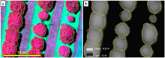 (a) False colour (NIR, Red, Green) orthomosaic; and (b) corresponding CHM of lychee trees pre-pruning, including the GEOBIA delineation result (yellow outlines).