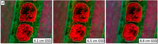 The Parrot Sequoia imagery was processed in Pix4Dmapper Pro (Pix4D, Lausanne, Switzerland) to produce an orthomosaic, a DSM and a DTM for each of the six flights, i.e., two collection dates at three different heights. The DSM was created based on the generated point cloud and the inverse distance-weighted interpolation method in Pix4Dmapper Pro. The DTM was generated using the automatic function in Pix4Dmapper Pro that uses the raster DSM and computes a classification mask of features above ground to generate a raster DTM based on ground features only. The DTM GSD was set to five times the GSD of the orthomosaic, as recommended by Pix4D. A canopy height model (CHM) was produced by subtracting the DTM from the DSM. The three flying heights produced orthomosaics with GSDs of approximately 4.1 cm, 6.5 cm and 8.8 cm, respectively.