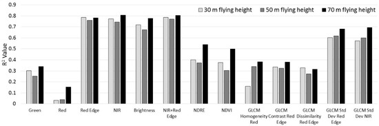 R2 values based on the positive relationships between field measured PPC and image derived spectral bands, indices and texture measures produced from imagery collected at 30, 50 and 70 m flying height.