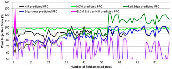 To estimate PPC of the pre-pruned tree crowns, for which no field data were collected, the best-fit equations between the post-pruned field derived PPC and the spectral bands, indices and texture measures were applied to the pre-pruned imagery to assess if these provided a realistic representation of PPC (Figure 10). The NIR band was found most useful for predicting PPC from the pre-pruning image, based on a visual assessment of the tree crowns and their within-tree crown gaps. The NDVI showed little variation in estimated PPC, most likely because of saturation issues [54]. The use of the red edge band significantly overestimated PPC for many of the tree crowns. Using the texture measures for estimating PPC provided unrealistically large PPC variation and in many cases significantly underestimated PPC based on expectation (Figure 10).