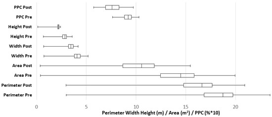 Pre- and post-pruning differences in minimum, Q1, median, Q3 and maximum values for the 189 mapped lychee trees for tree crown perimeter, area, width, 90th percentile height, and PPC measured from the UAV imagery collected at 30 m height.