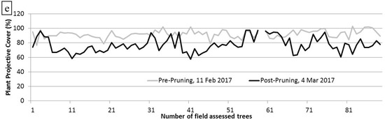 The mapping of tree structural parameters before and after pruning enabled an assessment of the impact of the pruning effects. A significant decrease in the average value of the tree structural parameters was observed for the 189 trees within the orchard between pre- and post-pruning. Decreases in the tree crown perimeter (1.94 m; 10.9%), area (3.49 m2; 25.9%), width (0.567 m; 14.7%), 90th percentile tree crown height (0.616 m; 22.3%) and PPC (14.8%) were established (Figure 11 and Figure 12). According to [12], the recommended thinning size of a lychee tree is between 15% and 25% from its initial size. Hence, the pruning results based on all 189 mapped trees showed good agreement with the recommendation. In most cases (179 out of 189 trees), a decrease was observed in the tree structural measurements for the individual tree crowns. However, some of the smaller and newly planted lychee trees (10 out of 189 trees) were not pruned, and hence the structural measurements stayed the same or slightly increased (Figure 12).