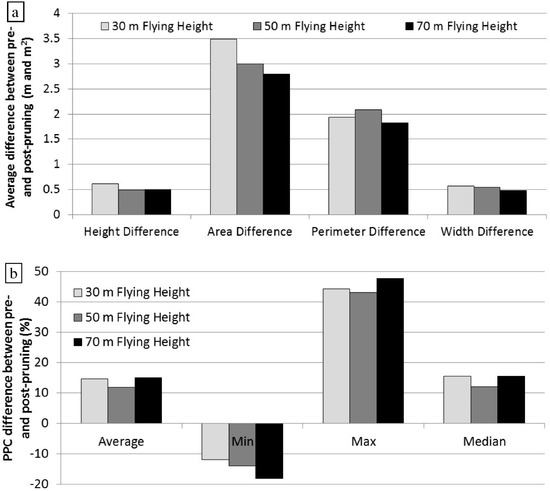 (a) Pre- and post-pruning differences for the 189 field assessed lychee trees for the 90th percentile tree crown height, area, perimeter, width; and (b) PPC, as a function of flying height.