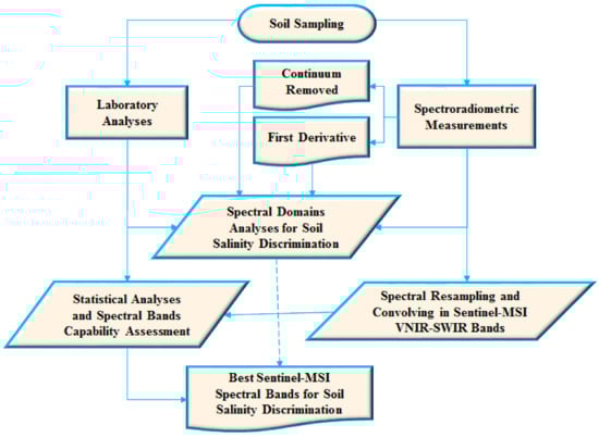 The used methodology is summarized in Figure 1, involving five fundamental steps: (1) A field campaign was organized and a total of 160 soil samples were collected with various salinity levels, from extreme salinity (Sabkha) to non-saline soil (agricultural fields). Observations and remarks about each soil sample were noted, photographed and its geographic location was recorded using GPS; (2) The bidirectional reflectance factor was acquired above each soil sample in a Goniometric-Laboratory using an ASD (Analytical Spectral Devices) FieldSpec-4 high resolution (Hi-Res) spectroradiometer [23]. The spectra of the representative salinity classes were transformed using the continuum-removed reflectance spectrum (CRRS) [24], and the first derivative (FD) [25]. Then, all the measured spectra were resampled and convolved in the solar-reflective spectral bands of Sentinel-MSI sensors using the Canadian Modified Herman transfer radiative code (CAM5S) [26] and the relative spectral response profiles characterizing the filters of each band of MSI; (3) In the laboratory, the soil reaction (pHs), the electrical conductivity (EC-Lab), and the major soluble cations (Na+, K+, Ca2++, and Mg2+) and anions (CO32−, HCO3−, Cl−, and SO42−) extracted from a saturated soil paste were measured, as well as the Sodium Adsorption Ratio (SAR) was calculated [27]; (4) These analyses and the field observations relative to each soil sample were used for interpretation and examination of the measured spectra and their transformations (CRRS and FD); (5) Finally, statistical analyses were conducted using second-order polynomial regression (p < 0.05) between the measured EC-Lab and the resampled and convolved reflectances in the MSI spectral bands were applied to corroborate or to deny which spectral domain and which spectral bands are significant for soil salinity discrimination.