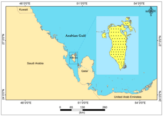 The Kingdom of Bahrain (25°32′ and 26°00′N, 50°20′ and 50°50′E) is an archipelago of 33 islands located in the Arabian Gulf, east of Saudi Arabia and west of Qatar (Figure 2) with a total land area of about 778.40 km2. According to the aridity criteria and the great variations in climatic conditions, Bahrain has an arid to extremely arid environment [28]. The climate is characterized by high summer temperatures of an average 45 °C during June-September and an average of approximately 17 °C in winter from December to March. Rain is sparse, and occurs primarily from November to April, with an annual average of 72 mm, sufficient only to support the most drought-resistant desert vegetation. Mean annual relative humidity is over 70% due to the surrounding Arabian Gulf water, and the annual average potential evapotranspiration rate is 2099 mm [29]. Under such climatic conditions, where precipitation is excessively low to maintain a regular percolation of rainwater through the soil, soluble salts are accumulated in the soil, influencing soil properties and environment causing low soil productivity. Indeed, these factors have significant impacts on land degradation, crop production, economic aspects, and infrastructure, as well as ecosystem functionality, human wellbeing, and sustainable development [30]. Geologically, Bahrain is characterized by Eocene and Neocene rocks, which are partly covered by Quaternary sediments and a complex of Pleistocene deposits. The dominant rocks are limestone and dolomitic-limestone with subsidiary marls and shales. The leading structure is the north–south axis of the main dome, with minor cross-folds predominantly tilting from northeast to southwest. The beds are gently inclined towards the coast from the center of the main island. The fringes of Bahrain are covered by more recent marine and Aeolian sand dunes, which were derived from the Arabian land connection across the present Arabian Gulf.