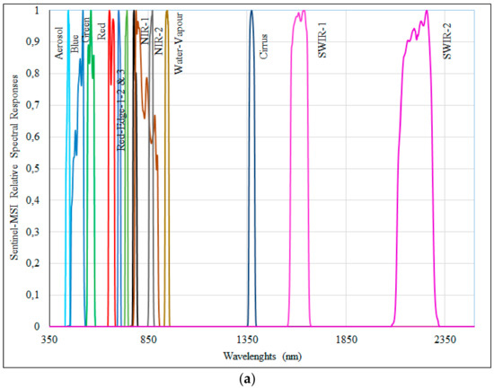 The Sentinel-2 satellite was launched on 23 June 2015 with the MSI on board. The synergy between Sentinel-MSI and Landsat-OLI significantly increase the temporal resolution for several environmental and natural resource applications, such as the vigor of vegetation cover, emergency management, soil salinity dynamics, water quality, and climate change impact analysis at local, regional, and global scales. Sentinel-MSI is the result of close collaboration between the European Space Agency, the European Commission, industry, service providers, and data users. The MSI images the Earth’s surface reflectivity with a large field of view in 13 spectral bands in the VNIR and the SWIR at 10, 20, and 60-m pixel sizes. The swath of each Sentinel-MSI scene is 290 km, permitting global coverage of the Earth’s surface every 10 days. The MSI radiometric performance is coded in 12 bits, enabling the image acquisition in 4095 digital numbers, ensuring radiometric accuracy of less than 5% and an excellent signal-to-noise ratio [47]. Table 1 summarizes the effective bandwidth characteristics for MSI.