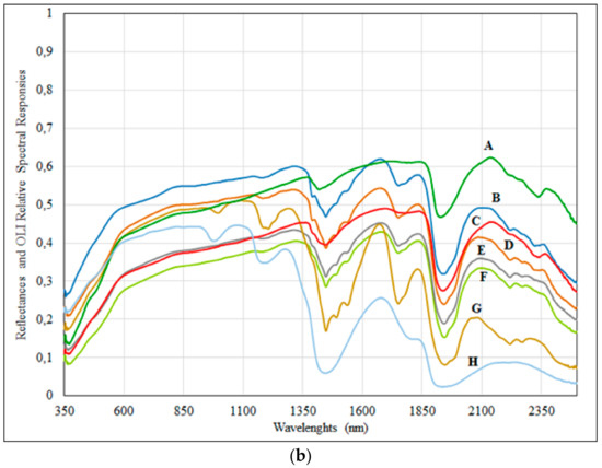 Otherwise, in the VNIR region, the spectra of the selected eight soil classes with different salt content showed a severe confusion caused by the soil optical properties (i.e., color, brightness, texture, etc.) dominating the signal in this spectral region. For example, the spectra of the sample “D” (195 dS/m) coincide with that of sample “H” (507 dS/m), although they do not have the same EC-Lab values, because the soil characteristics play a fundamental role in this confusion (Figure 3b and Table 3). In fact, sample “D” is a sandy soil characterized by small amount of gypsum crystals and shells, and the beginning of salt crust formation (light gray and white color, 10YR 7/2), while sample “H” is a pure salt-sabkha (white color, 10YR 8/1). Similar confusion is observed between the opposite sample classes “A” and “H”, respectively, with 26 and 507 dS/m EC-Lab values. Moreover, the samples “A” and “G” are sandy soils with EC-Lab of 26 and 445.5 dS/m, respectively; however, these two samples exhibited approximately the same spectral behavior and amplitude in the VNIR according to their color (Figure 3b and Table 3). Consequently, the separation between “D” and “H” or “A” and “G” samples in the VNIR, in general, could not be applied, especially in the coastal and blue bands. However, Figure 3b shows that the increase of EC-Lab values synchronize with the significant variation among the salt-affected soil spectra, and progressively from the 1000 to 2500 nm portion of the spectrum. For instance, in this SWIR domain, from “A” to “H” soil samples, the spectra changed progressively in amplitude and shape as a function of EC-Lab (from 26 to 507 dS/m, see Table 3), as well as a function of SAR (from 46.9 to 444.7 (mmoles/l)0.5). The observed ambiguity between “D” and “H” or “A” and “G” samples in the VNIR, is completely dismissed in the SWIR and it is easy to see gradually the spectral signature position of each sample according to its EC-Lab content. Definitely, the Sentinel-MSI SWIR-1 and SWIR-2 bands show the highest potential to efficiently discriminate among different degrees of salinity in the soil (Figure 3b). These findings corroborate the results of other studies characterized several soils rich in sulfate minerals, carbonates, and bicarbonates, sodium chloride, etc., in the SWIR regions [1,6,14,15,48,50,51,55,56].