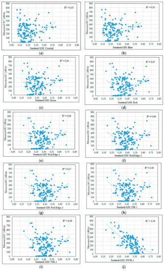 Considering the 160 soil samples, several statistical functions were fitted between the measured EC-Lab content and the resampled and convolved reflectances in the VNIR and SWIR bands of the MSI sensor. A second-order polynomial regression (p ≤ 0.05) allowed the best fit. Obtained results showed that the reflectances in the four visible bands (coastal, blue, green, and red) are insignificantly correlated (R2 ≤ 0.05) with the salt content in the soil (Figure 7a–d). These very low correlations are also achieved in the red-edge (R2 ≤ 0.07) and in the NIR (R2 ≤ 0.09) spectral bands (Figure 7e–i). Indeed, the regressions presented in Figure 7a–i illustrate that, independently of the salt-content, the 160 sampled points are scattered randomly without any trend or substantial relationship between these bands’ reflectances and the EC-Lab. The statistical results corroborate the previous spectral signatures and their transformation (CRRS and FD) analyses indicate that the Sentinel-MSI VNIR spectral bands are not appropriate and not consistent for correct and accurate discrimination among various soil salinity classes in arid landscape. Moreover, these findings are consistent with Nawar et al. [13,60], which concluded that the visible bands of ETM+ and ASTER have the lowest contribution to estimate soil salinity comparatively to the other spectral bands. Additionally, recently Rahmati and Hamzehpour [19] revealed that no significant correlation (R2 ≤ 0.03) exists between the measured EC-Lab and the reflectance in the visible bands of ETM+ sensor. Contrarily, the Sentinel-MSI SWIR bands 1 and 2 have the highest power for soil salinity discrimination with an R2 of 0.50 and 0.64, respectively (Figure 7g,k), which are consistent with several other studies that showed the potential of these spectral wavebands of OLI, ALI EO-1, and WorldView-3 sensors for salt-affected soil discrimination [14,15,61,62]. According to Nawar et al. [60], the SWIR bands of ASTER, especially bands 9, 8, and 7 exhibited the highest contribution for soil salinity estimation. Moreover, another study [19] indicated that the SWIR bands of the ETM+ sensor increases the accuracy of the soil salinity prediction, whereas several other studies exploring hyperspectral remote sensing showed that the bands within the SWIR regions are the best for evaluating the soil salinity [59,63,64].
