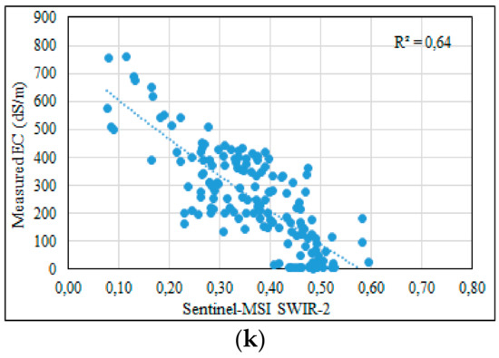 Second-order fitting between the measured electrical conductivity (EC-Lab) and the Sentinel-MSI spectral bands (a–k).