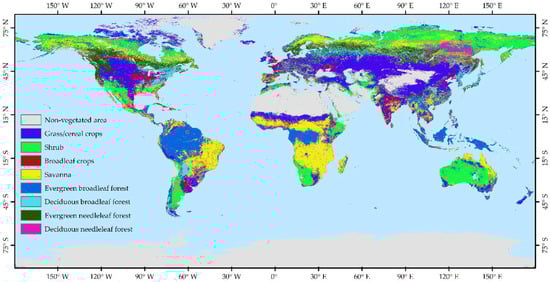The MODIS land cover product (MCD12Q1) is used here to determine the vegetation region as well as the biome types for the analysis of intra heterogeneity of typical biomes. MCD12Q1 derived through a supervised tree classification scheme is a 500-m resolution tiled land cover dataset that incorporates five different land cover classification schemes: the International Geosphere Biosphere Program (IGBP), University of Maryland (UMD), MODIS-derived LAI/FPAR, MODIS-derived Net Primary Production (NPP), and Plant Functional Type (PFT). The LAI/FPAR classification scheme product was chosen and aggregated to a 1-km resolution for ease of analysis. This scheme categorizes the vegetation regions into the following eight biome types: grasses/cereal crops, shrubs, broadleaf crops, savanna, evergreen broadleaf forest, deciduous broadleaf forest, evergreen needleleaf forest, and deciduous needleleaf forest [7]. The biome classification scheme is defined according to the vegetation structure and optical property accounting for the radiative transfer modeling of vegetation medium, the precise description of which can be found in Reference [3]. The biome distribution map of the year 2010 is shown in Figure 1.
