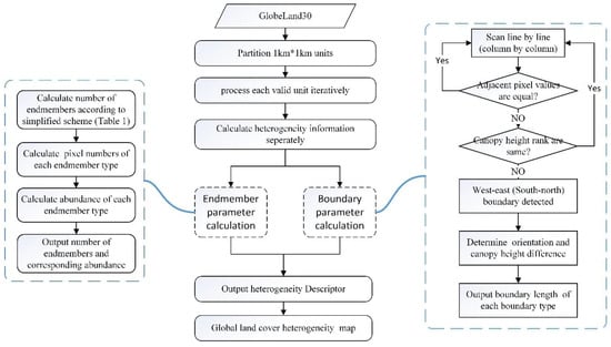 The GlobeLand30 data are first partitioned into multiple 1 km × 1 km units for the next analysis. Each unit overlaps approximately 34 × 34 pixels of GlobeLand30. The units with valid data are then utilized to extract compositions and boundary information separately. For the compositions, the land cover types are generalized to endmember types as in Table 1. The number of endmembers and the corresponding abundance are statistically calculated in a 1 km × 1 km unit. For the boundary information, the boundary is defined and calculated on a gridded form. The west-east and north-south boundary are detected by scanning adjacent rows and columns respectively. If the canopy height ranks given in Table 1 of the adjacent land cover are different, the boundary is deemed valid. Then the type of boundary and boundary length of each type are calculated. Finally, the maps of the number of endmembers and overall boundary length at the 1-km scale are generated at the global scale. The flow chart describing the detailed extraction procedures is given in Figure 3.