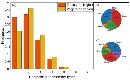 Frequency histogram of endmember count for 1-km resolution pixels; terrestrial region refers to land regions excluding Antarctica on the Earth. The pie chart (b,c) demonstrates the fraction of endmember classes of pure pixels over vegetation regions and the overall proportions of endmember classes over terrestrial regions.