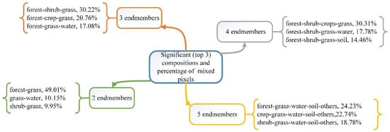 Normally, a mixed pixel could be decomposed into a collection of constituent spectra (endmember spectra) and a set of corresponding fractions (endmember abundance) [30]. Endmembers usually correspond to several macroscopic objects in the scene [38]. The mixed reflectance of a pixel could be considered as a function of the endmember’s spectra and abundance. This theory is widely accepted and adopted in spectral mixture analysis e.g., the estimation of vegetation cover percentage of semiarid regions [39,40]. We used the number of endmembers and the corresponding abundance to express the composition of a mixed pixel in this paper.