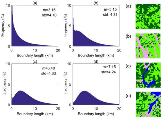 Frequency distribution of the boundary length for different endmember types ((a–d) represent two, three, four, and five endmembers, respectively) and the corresponding land cover images for a boundary length of 20,000 m. ‘m’ and ‘std’ stand for mean and standard deviation of the boundary length, respectively.