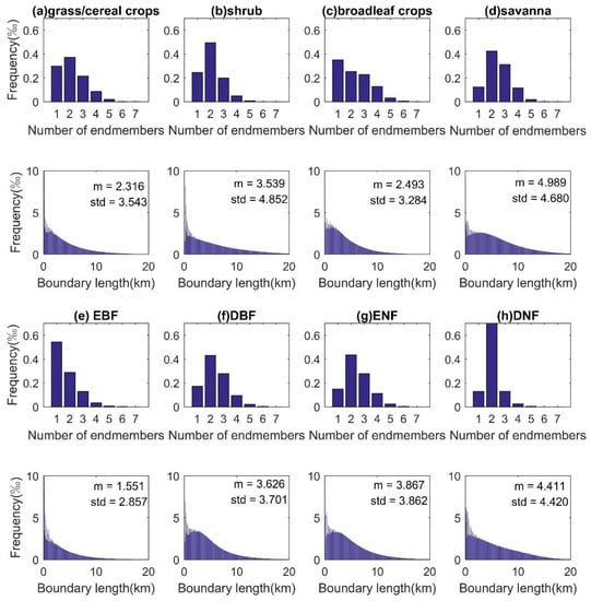 Moderate-resolution land cover products usually represent each pixel according to the dominant land cover. Parameter inversion algorithms using these land cover products inevitably overlook intra heterogeneity characteristics. For example, MODIS MCD12Q1 was adopted in LAI/FPAR products to characterize vegetation and soil properties in a pixel [41]. This characterization scheme was somehow unreasonable due to the intra land cover heterogeneity. A depiction of heterogeneity characteristics was needed to better parameterize the properties in typical biomes. The number of endmembers and the boundary length were analyzed for eight typical biomes (Figure 9): grasses/cereal crops, shrubs, broadleaf crops, savanna, evergreen broadleaf forest, deciduous broadleaf forest, evergreen needleleaf forest, and deciduous needleleaf forest.