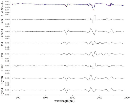 To reduce the effects of the edge noise, the hyper-spectral measurements were acquired between 390 and 2437 nm. The first step computes the approximation and detailed coefficients of the wavelet decomposition, which are used in the Stepwise-PLS regression analysis. Each soil reflectance spectrum was subjected to eight levels of DWT. Combining the detailed and approximate signals gives more complete coverage of the spectral information than the approximate or detailed signals alone. The approximate coefficients are severely distorted when the decomposition level is too high; conversely, when the decomposition level is too low, the information in the approximate coefficients is too verbose. After several attempts, the approximate signal was optimized at four levels. Hence, after obtaining the detailed coefficients at levels 3, 4, 5, 6, 7, and 8, the original reflectance spectroscopy was replaced with the approximation coefficients at level 4. The spectral signal was decomposed into different wavelet functions at level 6, and a single branch was reconstructed from the approximated DWT coefficients at level 4, as well as the detailed DWT coefficients at level 6 (Figure 2). The approximate coefficients were nearly independent of the level, but the signals of the detailed coefficient reconstruction were influenced by the different wavelet functions. Therefore, one must try different wavelet functions in the prediction model and find the best wavelet function, as well as its appropriate decomposition level. Meanwhile, to compare the application effects of the stepwise and standard PLS methods, we regressed the wavelet coefficients of the various wavelet functions and their decomposition levels using the two PLS methods. When performed by PLS and Stepwise-PLS, these approaches were named DWT–PLS and DWT–Stepwise-PLS, respectively.