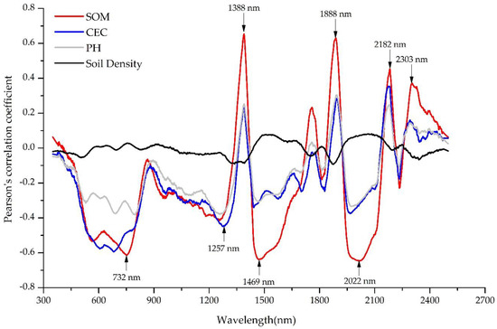 Pearson’s correlation coefficients between the soil-reflection spectral bands and soil properties (soil organic matter (SOM), cation exchange capacity (CEC), pH, and soil density), as functions of wavelengths.