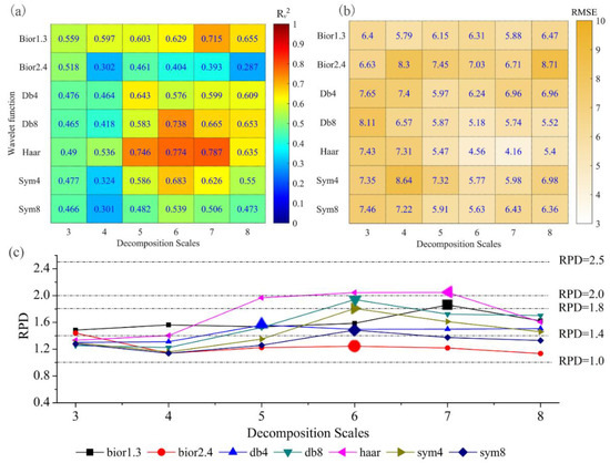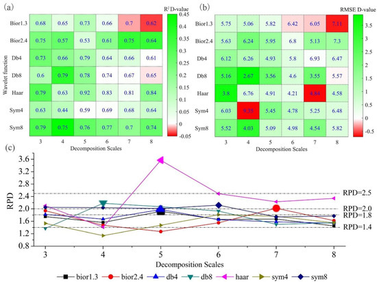 The RPD values of the DWT–Stepwise-PLS at levels 3–8 are shown in Figure 7b and Figure 8b. The average RPD of the CEC predicted by DWT–Stepwise-PLS was higher for the Haar and Sym8 wavelet functions (2.36 and 1.96, respectively; see Table 7) than for the other wavelet functions. Moreover, according to the CEC validation results, the effect of DWT–Stepwise-PLS using the Haar and Sym8 wavelet functions largely depends on the decomposition level of the DWT; the former appears to be more effective at higher decomposition levels, whereas the latter tends to be relatively stable at each level (Figure 7b).