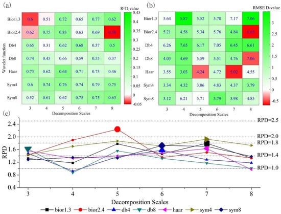Furthermore, in order to directly compare the DWT–PLS and DWT–Stepwise-PLS model, the difference between the R2 values of DWT–PLS and DWT–Stepwise-PLS were used to compare the model efficiencies, and were defined as the R2 D-value. Additionally, the difference between the RMSE of DWT–PLS and DWT–Stepwise-PLS were defined as the RMSE D-value. Some statistical parameters of RPD for DWT–PLS and DWT–Stepwise-PLS models are also calculated: the maximum value, minimum value, and average value of PRD at different decomposition levels of the same wavelet functions; and the difference (D-value) of PRD between DWT–Stepwise-PLS and DWT–PLS.