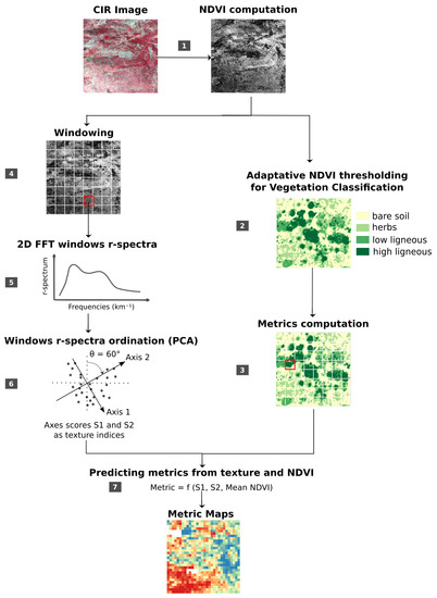 The general workflow of this study was built around the comparison of discrete and continuous approaches (Figure 1). First, the spatial distribution of the four strata of interest (BS, H, LL, and HL) was identified from very-high-resolution coloured infrared (CIR) airborne images based on radiometric differences among strata in the visible and near infrared domains [] (Figure 1, step 1 and 2). We considered the four strata as pure and mutually exclusive. Next, we computed landscape structure metrics for individual vegetation strata and for grouped strata corresponding to ground strata (BS + H) and ligneous strata (LL + HL) considering homogeneous spatial units across the landscape (Figure 1, step 3). Then, we computed textural information from the Normalized Difference Vegetation Index (NDVI) layer of the CIR image (see Figure 1, steps 4–6). The textural information was obtained with the FOTO method, which is fully detailed bellow (Section 2.5). Finally, we tested the performances of the textural information as predictor variables for the estimation of landscape structure metrics when used with machine learning regression (Figure 1, step 7). Couteron et al. [] highlighted that textural attributes lead to poor discrimination ability between landscapes with opposite structural patterns, such as patches of bare soil and herbaceous vegetation included in a matrix of dense ligneous vegetation vs. patches of dense ligneous vegetation included in a matrix of bare soil and herbaceous vegetation. It is thus suggested that the combination of textural attributes with radiometric information may improve the discrimination in this situation []. Therefore, here we considered the synergy between these two types of information by comparing the performance of models aiming at estimating landscape structure metrics when trained with textural and radiometric information separated or combined (Section 2.5.3).