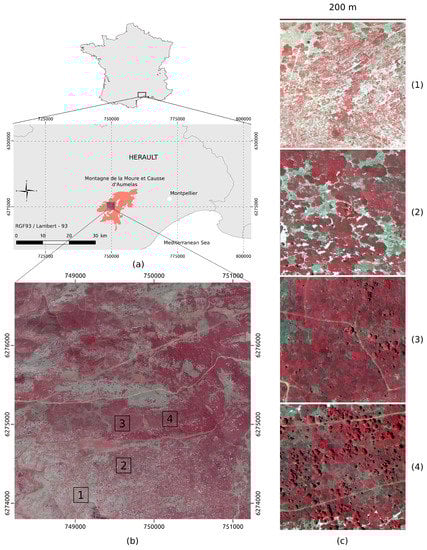 Mediterranean ecosystems are characterized by a complex landscape of heterogeneous mosaics. This heterogeneity is key to their exceptional level of biodiversity [] and results from long-term co-evolution of human activities associated with heterogeneous semi-open habitats []. However, the structure of these natural habitats is currently shifting due to changes in traditional management practices, as mentioned previously. Among the many Mediterranean open habitats, the pseudo-steppe with grasses and annuals of the Thero-Brachypodietea [] is threatened by the progressive encroachment of woody vegetation through natural successions due to the abandonment of grazing activities, and is also listed as a habitat of community interest by the European Council Directive 92/43/EEC, which aims to promote the maintenance of biodiversity. We focused on the site the Montagne de la Moure et Causse d’Aumelas, which is located in France, 30 km West of Montpellier (N, N) (see Figure 2a). It is part of the European Natura 2000 ecological network for natural habitat conservation, and it was selected for our study because it contains numerous habitats of high interest organized in landscape mosaics, including pseudo-steppe with grasses and annuals of the Thero-Brachypodietea.