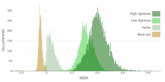 The discrimination between soil and vegetation is technically straightforward when visible and near-infrared information is available [], and the potential of VHSR imagery to map shrubs has also been demonstrated in various studies using either pixel-based image analysis (PBIA) or object-based image analysis (OBIA). The estimation of the fraction cover of shrubs and bare soil strata can be performed with PBIA with a simple thresholding on panchromatic gray level values [] or with supervised algorithms based on multi-spectral imagery []. OBIA involves preliminary segmentation of the image followed by a classification, and led to improved delineation of vegetation strata [,], especially for sub-metric spatial resolution [].
