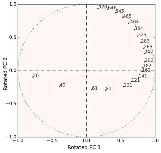 A table compiling the r-spectra was produced, each row corresponding to the r-spectrum of a given window, and each column corresponding to a spatial frequency. Then, a PCA was applied to this table []. The table was standardized prior to PCA in order to avoid excessive influence of low spatial frequencies []. The main axes resulting from the PCA could be linked to the texture, and the first two are usually related to the following orthogonal coarseness gradients in the literature [,]: the first axis usually corresponds to a coarseness gradient that evidences the contrast between coarse texture and fine/very fine texture, and the second axis to another coarseness gradient evidencing the contrast between intermediate–coarse texture and very coarse or very fine texture. Fine and very fine textures are generally linked to densely forested areas due to canopy grain, and the first gradient described previously is particularly useful when linking textural metrics with canopy structure of Amazonian forests [] or development stages in dynamic mangroves []. However, when studying the semi-open landscapes, the forest can be considered as secondary compared to intermediate–coarse or fine texture linked to patterns made by patches of dense ligneous vegetation included in a matrix of bare soil and herbaceous vegetation. In that respect, the first gradient was not the most relevant in the context of this study. Therefore, in order to simplify the interpretability of our results, we performed an orthogonal rotation aiming at defining a new first axis, evidencing the contrast between very coarse and intermediate or fine texture, which was thus better related to semi-open landscape structure.