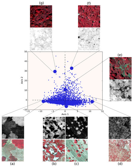 The selection of image subsets distributed along increasing values for the second axis highlights a coarseness gradient ranging from the structures described for the first axis (low values on second axis), to image subsets containing finely textured groups of trees embedded in a matrix of coarser texture corresponding to BS, H, and LL strata (Figure 5e, intermediate values on second axis), to image subsets characterized by very fine texture overall corresponding to closed canopies, with possible differences among canopy structures along the first axis (Figure 5f,g, higher values on second axis). As shown in Figure 5b,c, two windows with similar coarseness attributes in terms of coarseness defined by the two axes may show very different vegetation structure because of the insensitivity of Fourier decomposition to mean radiometric information. These results show that the first axis was a relevant descriptor of the succession of different strata (inter-strata heterogeneity), whereas the second axis showed structures corresponding to windows mainly occupied by the HL strata (intra-strata heterogeneity).